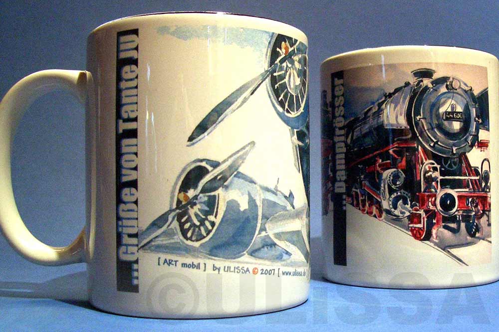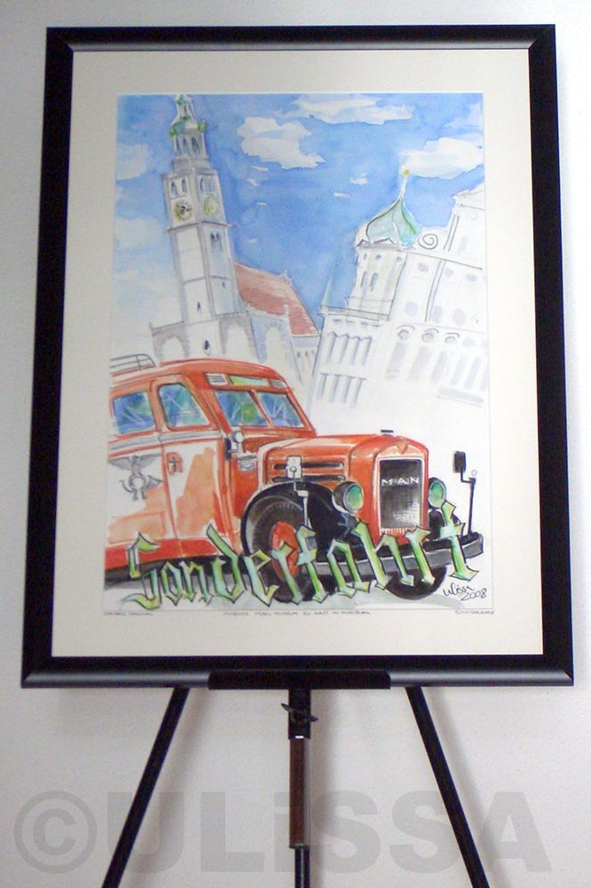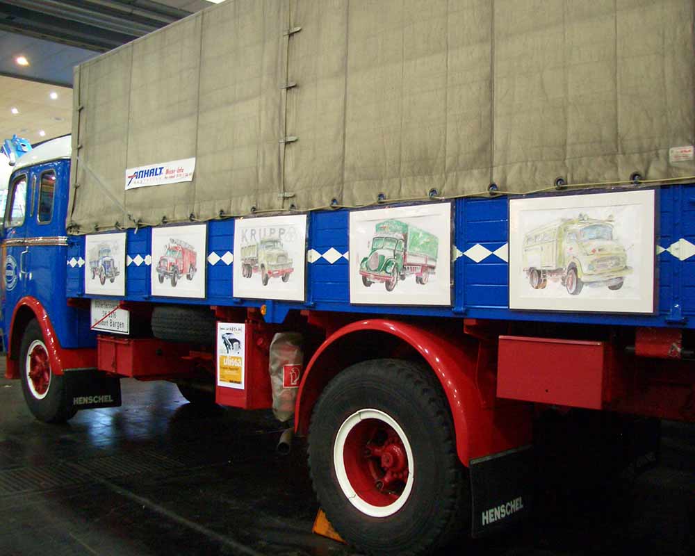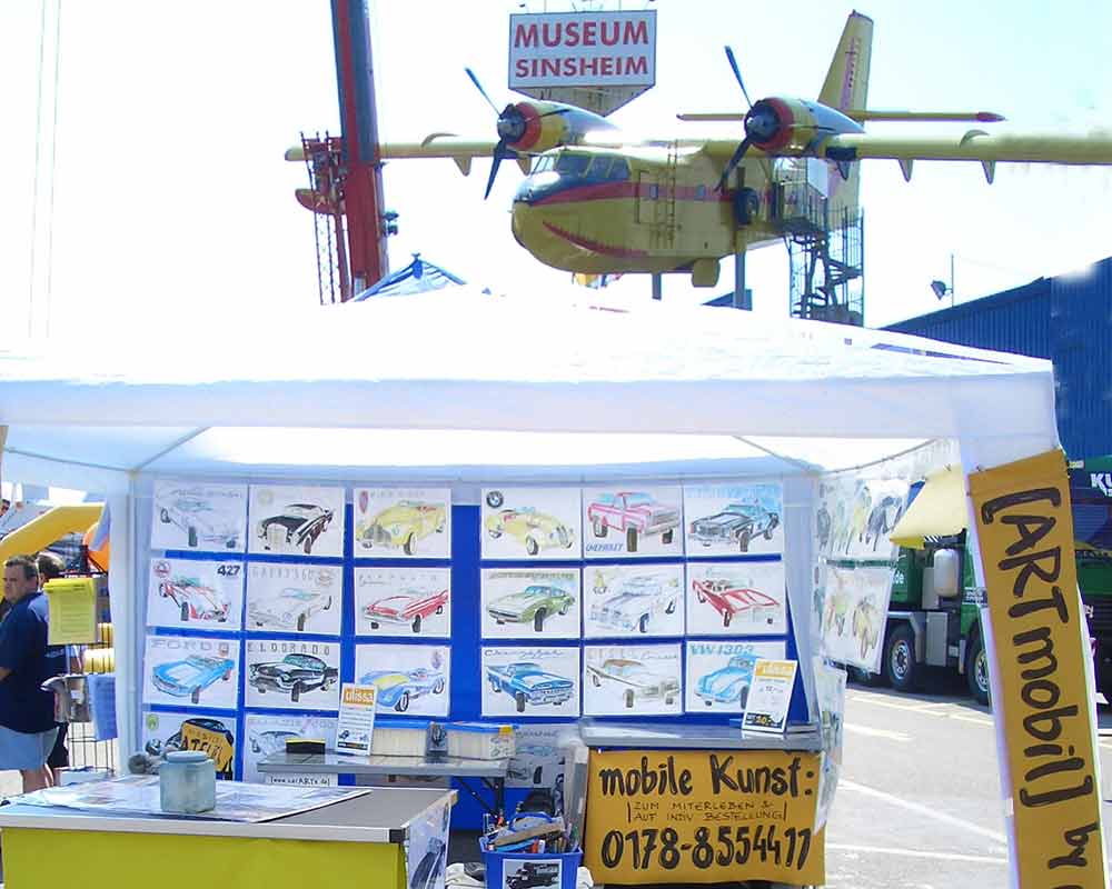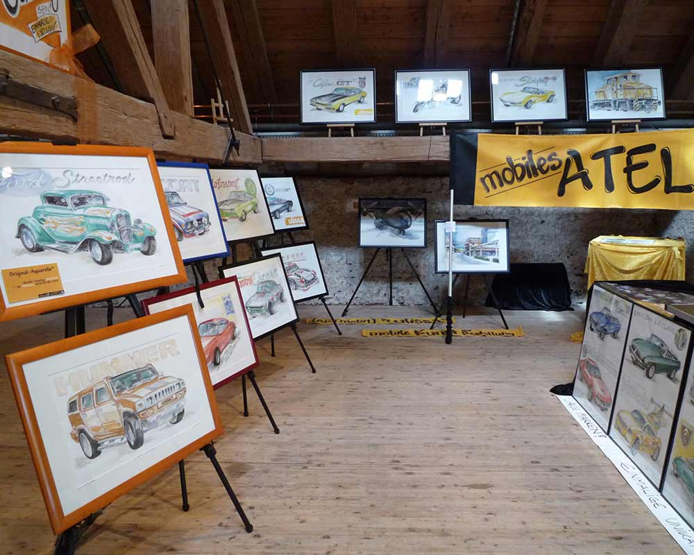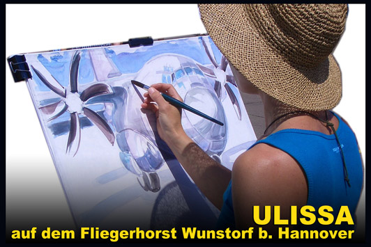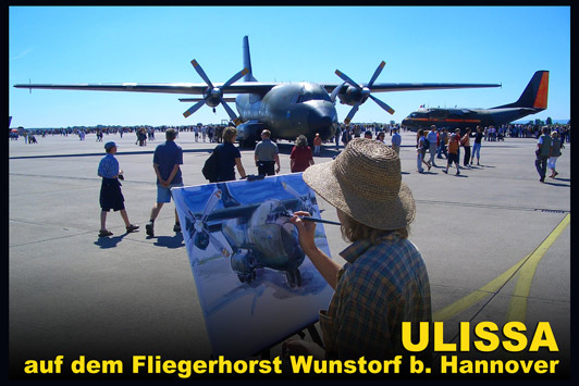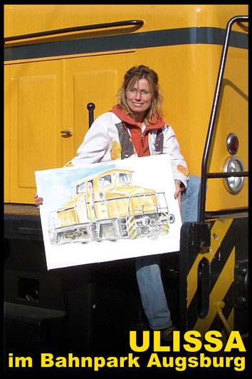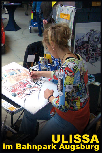 von Old- & Youngtimern, über Motorräder und seit 2004 bei der IAA Nutzfahrzeuge auch Oldtimer-LKW. Im gleichen Jahr die ersten Flieger-Portraits wie die Tante JU, 2006 dann sogar Lokomotiven im Bahnpark Augsburg. Für ihre professionellen ARTmobil-Ausstellungen sucht Ulissa aus über 250 Motiven passende zum Event aus. Wo die mobile Künstlerin schon überall ausgestellt hat...