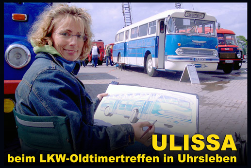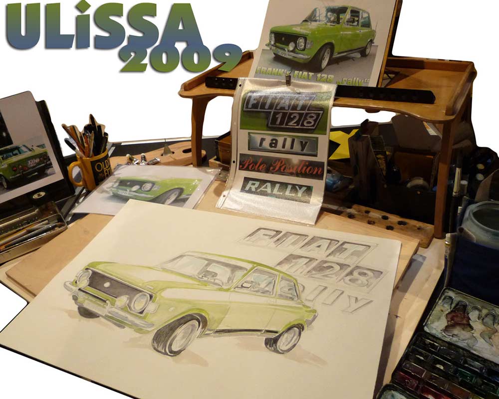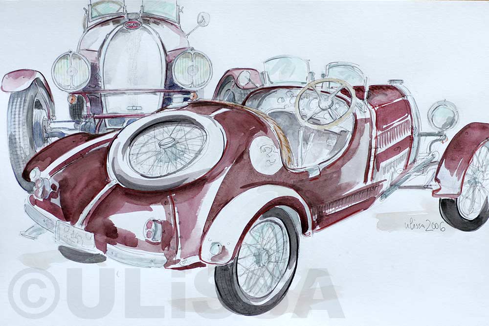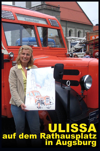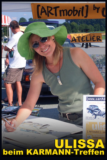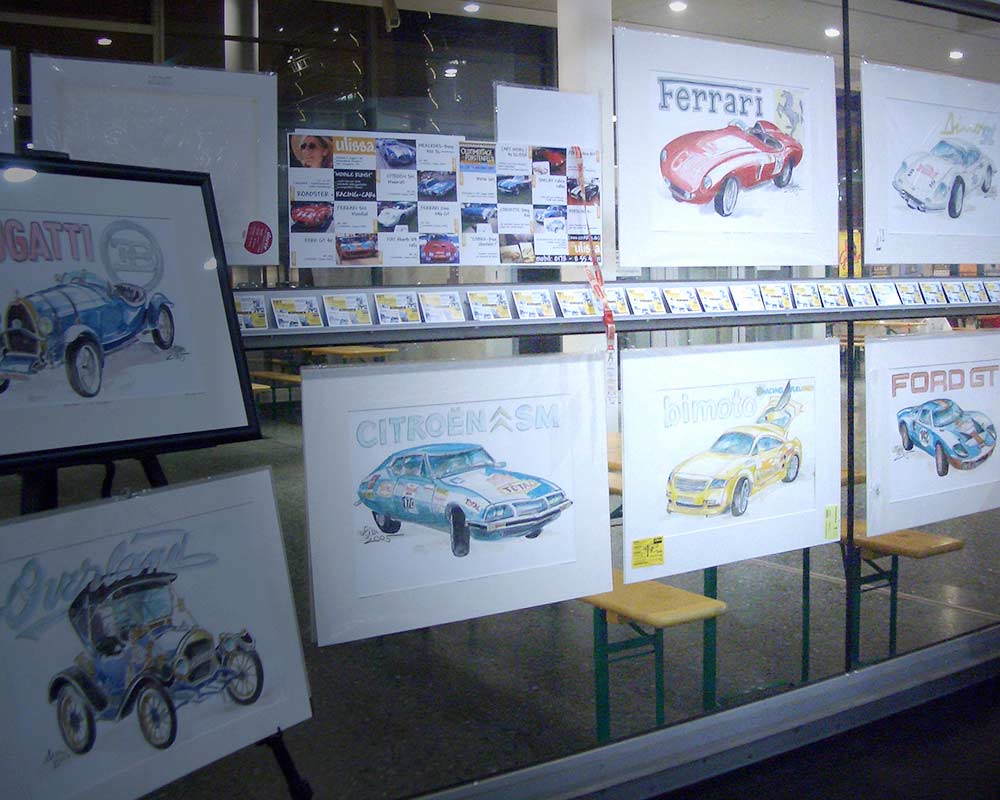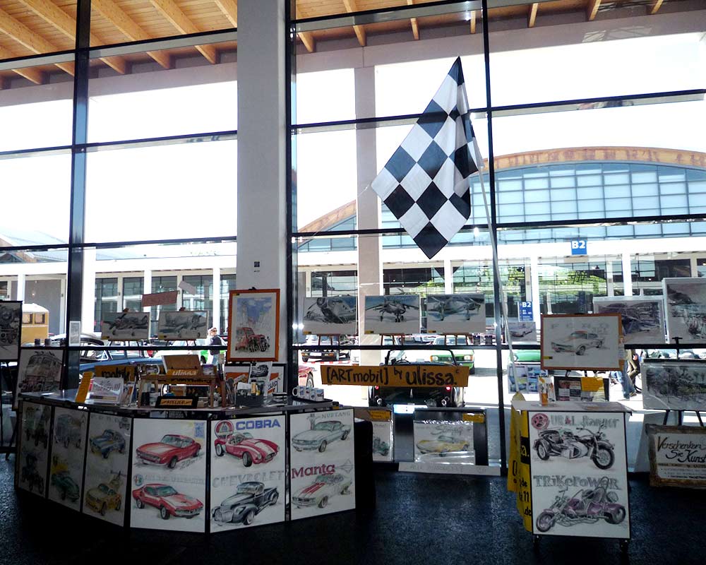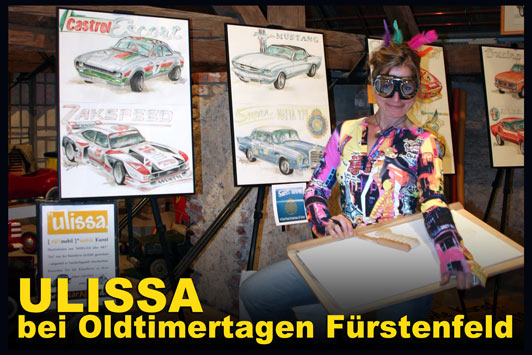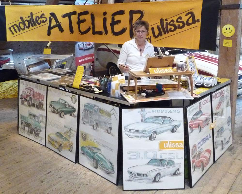 Ulissa, die mobile Künstlerin entdeckte ihre mobile Leidenschaft im Bugatti-Museum im Elsass. Wie alles begann/PDF Seit 1990 begeistert sie das Flair nostalgischer Fahrzeuge immer wieder aufs Neue. Über 250 Motive sind seitdem im Ulissa-typischen Stil entstanden: eine wundervoll, sympathische Symbiose aus mobiler Faszination, Technik & einmaliger MOBILER KUNST! Ihre Oldtimer-Portraits sind für Oldtimer-Enthusiasten ein Genuss. Wo ULISSA schon überall gemalt hat...