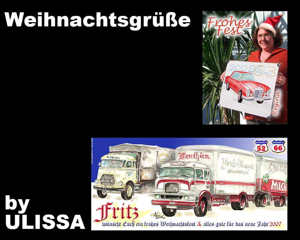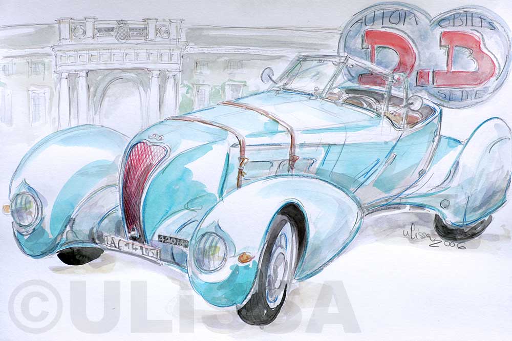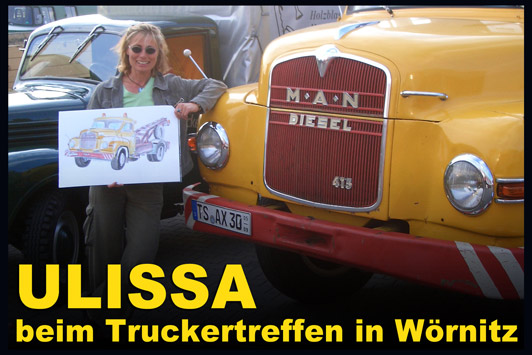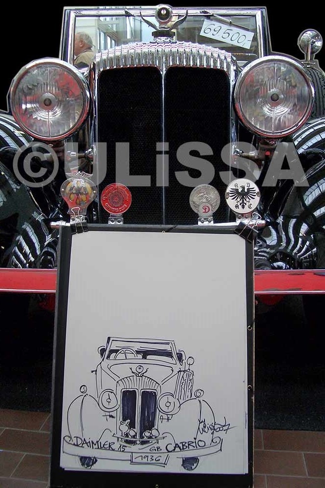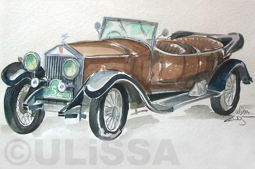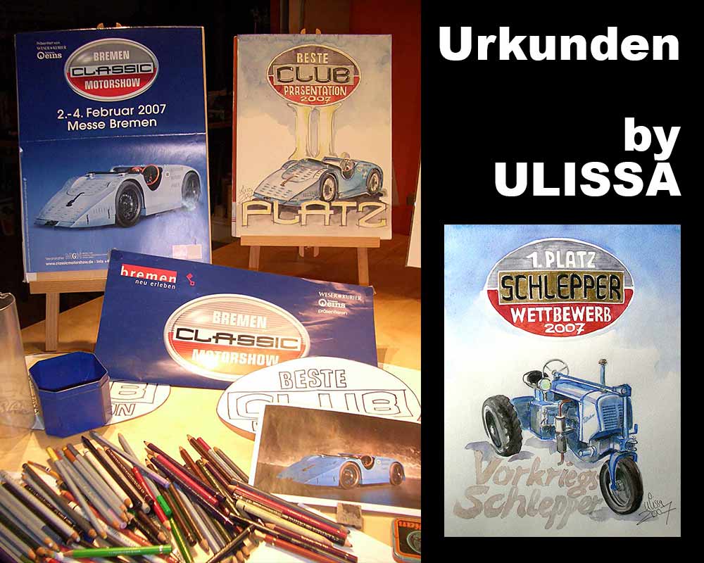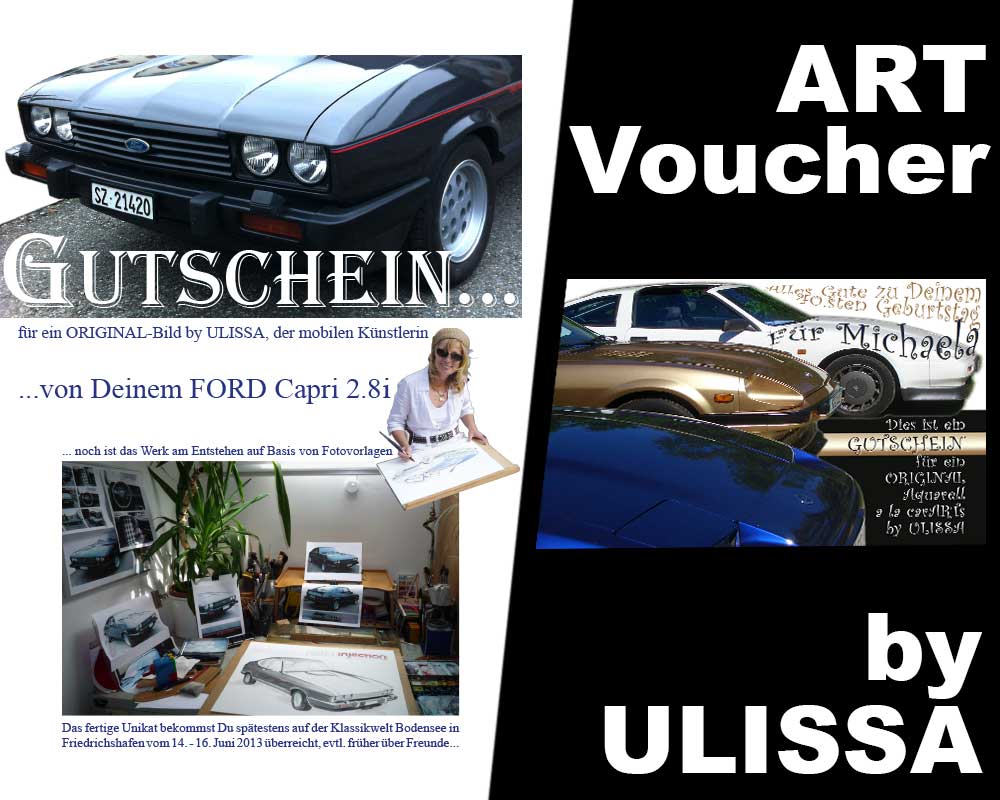 Ulissa, die mobile Künstlerin entdeckte ihre mobile Leidenschaft im Bugatti-Museum im Elsass. Wie alles begann/PDF Seit 1990 begeistert sie das Flair nostalgischer Fahrzeuge immer wieder aufs Neue. Über 250 Motive sind seitdem im Ulissa-typischen Stil entstanden: eine wundervoll, sympathische Symbiose aus mobiler Faszination, Technik & einmaliger MOBILER KUNST! Ihre Oldtimer-Portraits sind für Oldtimer-Enthusiasten ein Genuss. Wo ULISSA schon überall gemalt hat...
